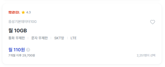 1. LTE 음성, 문자 무제한 / 데이터10GB (월 110원) ⭐⭐⭐⭐⭐